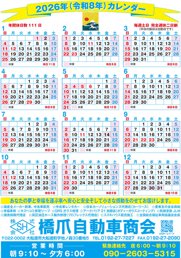 - GW、お盆休み、年末年始の連休には閉店していますが、緊急時には「愛車友の会会員」専用ダイアルにお電話いただきますと緊急対応いたします。